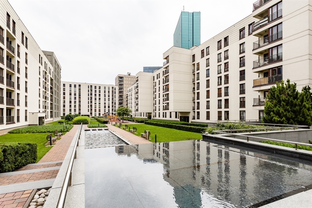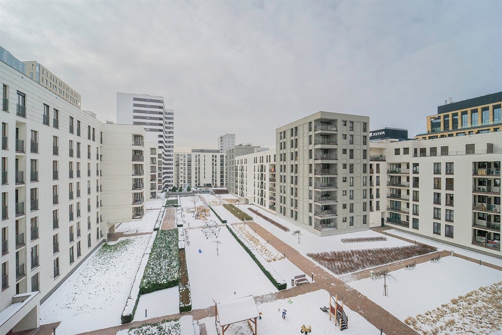 The unusual shape of the building and the internal patio filled with greenery and a children's playground emphasise the high quality of the design, which stands out from other apartment buildings in Warsaw.