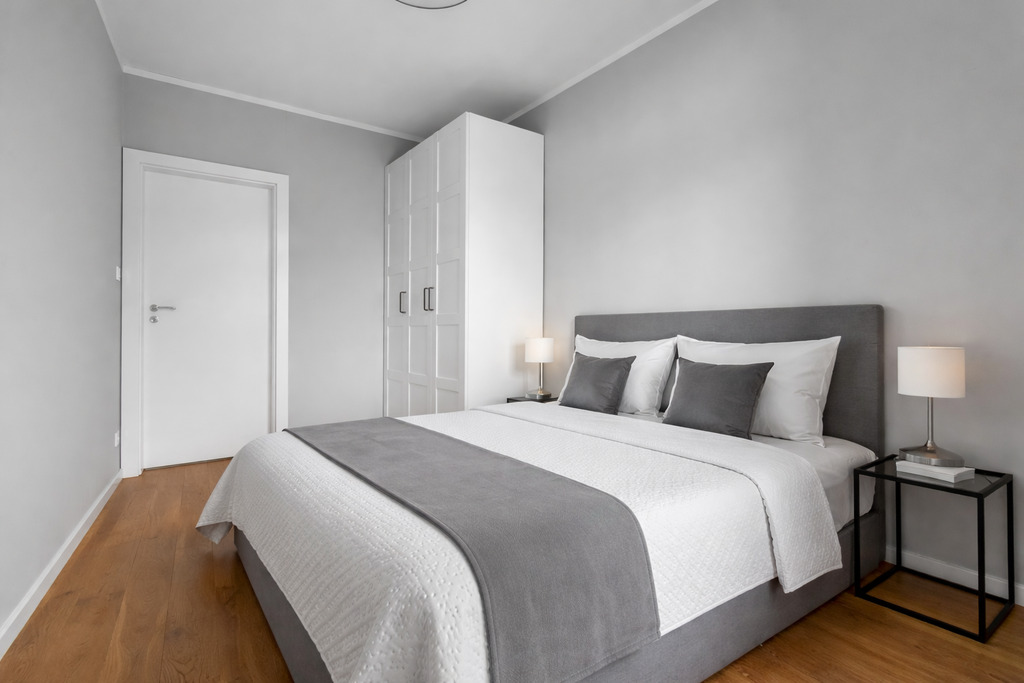 - sypialnia z łóżkiem i szafą