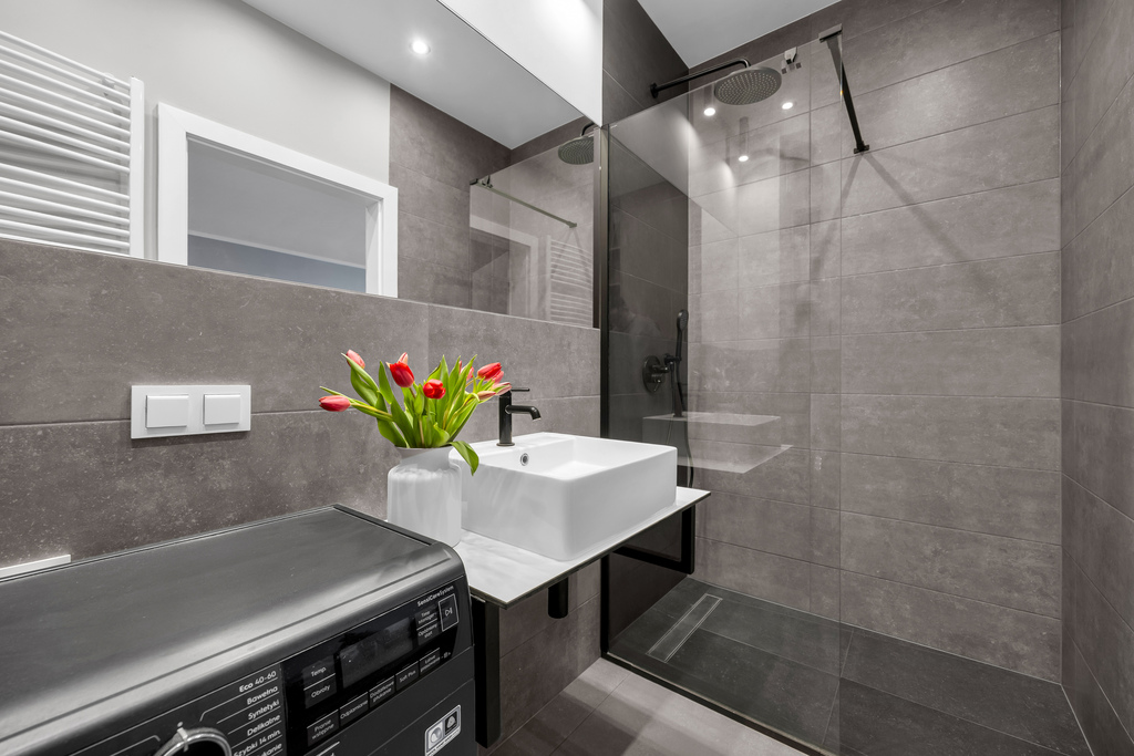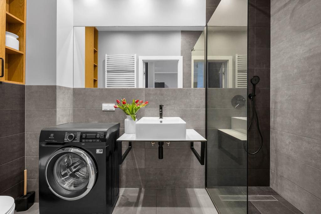- łazienka z prysznicem i pralką