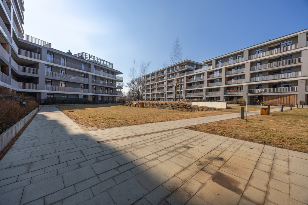The apartment is located in the modern, gated, and monitored Nowa Grochowska development at 3A Kokoryczki Street. This recent development is distinguished by its aesthetically pleasing architecture, well-maintained common areas, greenery, and amenities for residents.