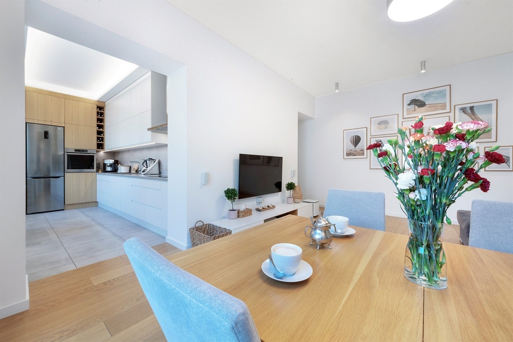 - kuchnia w pełni wyposażona w nowoczesny sprzęt AGD (płyta indukcyjna zintegrowana z okapem, zmywarka z automatycznym otwieraniem, lodówko-zamrażarka, piekarnik)