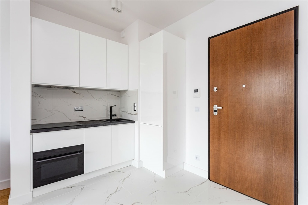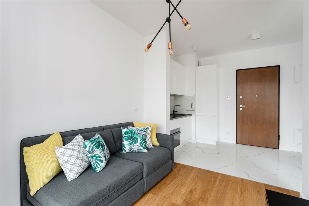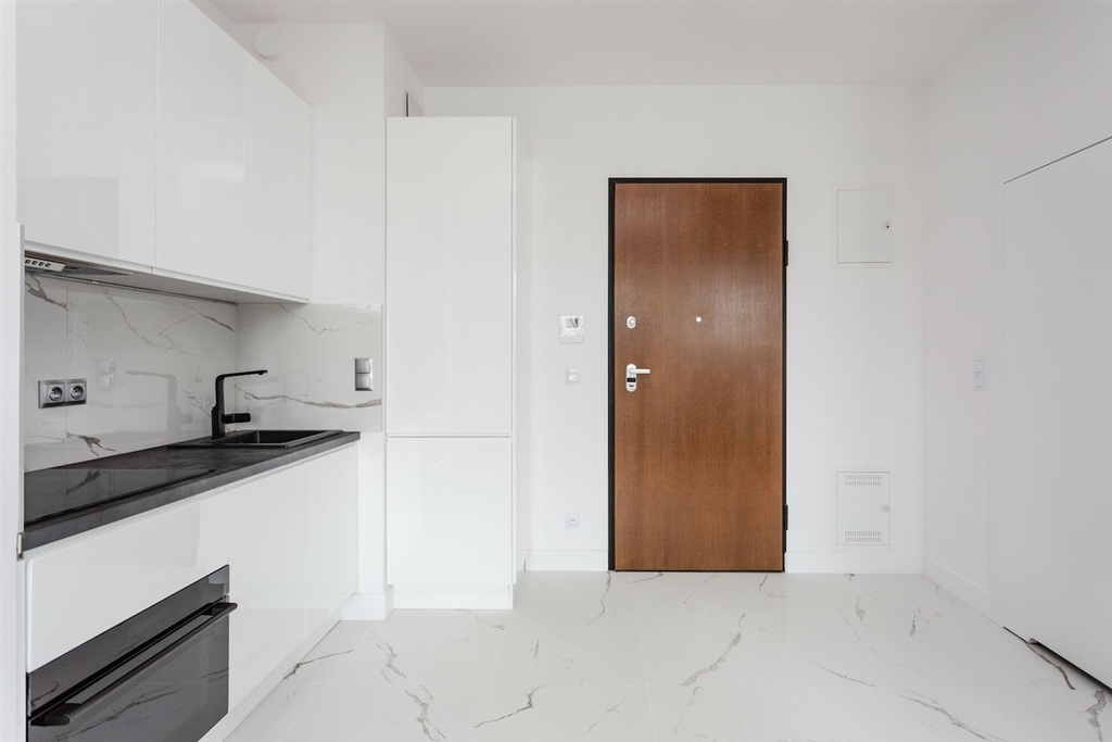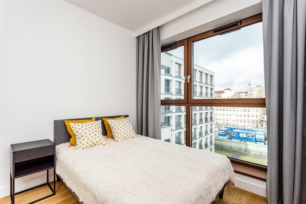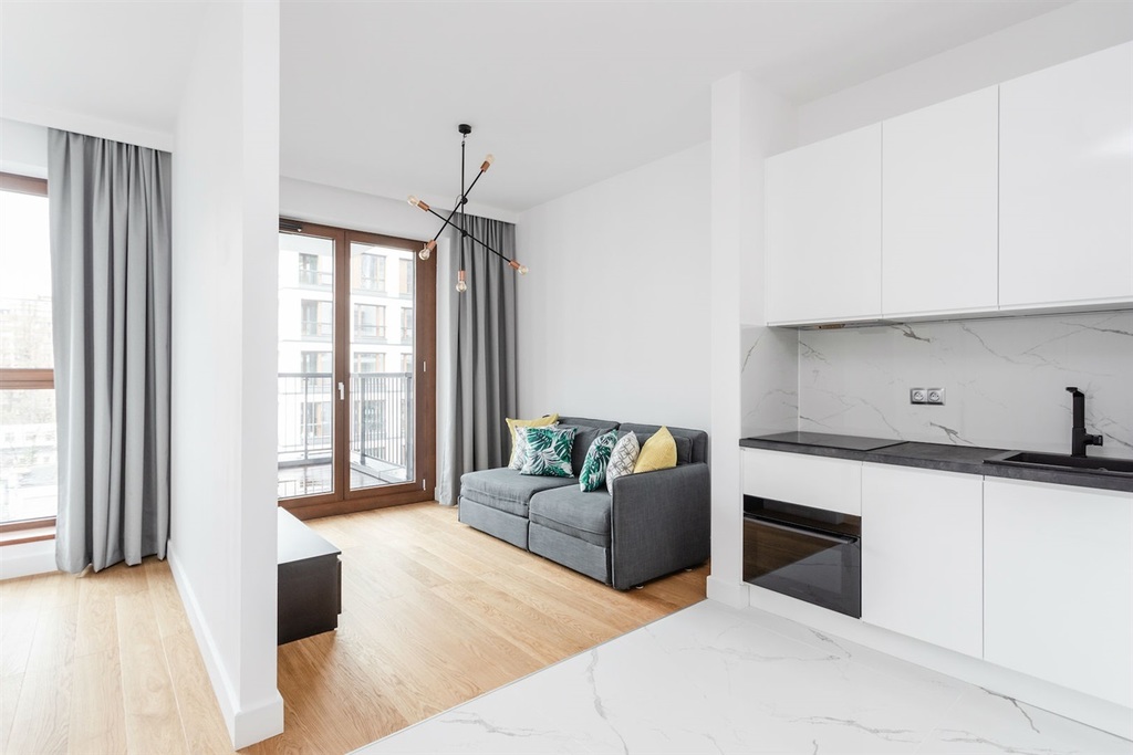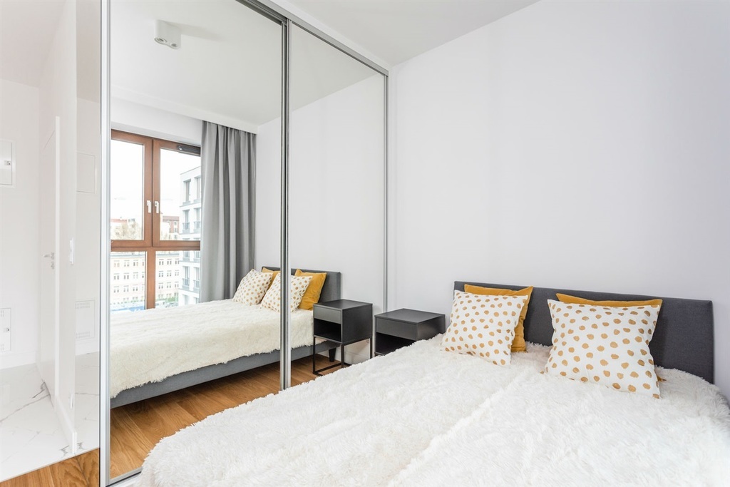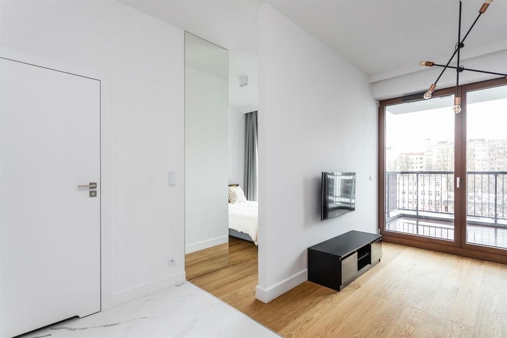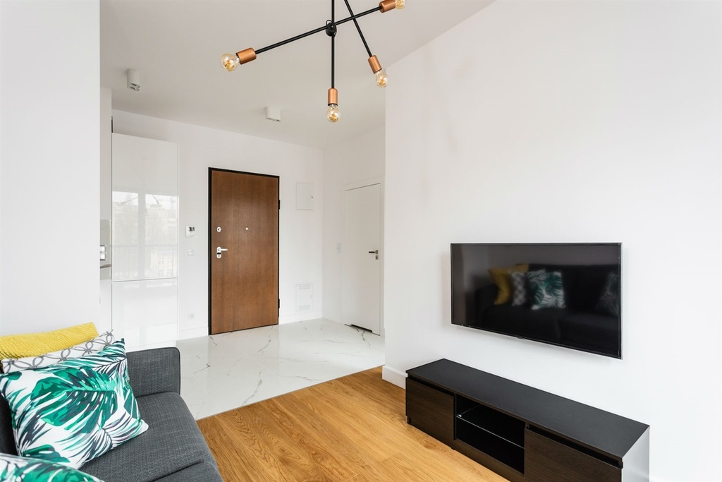 Mieszkanie wykończone w bardzo wysokim standardzie, z dbałością o najmniejszy szczegół. Jasna, drewniana podłoga świetnie koresponduje z białą zabudową meblową, zaś charakterystyczne elementy wnętrza i niebanalne oświetlenie sprawiają, że nieruchomość jest unikatowa.