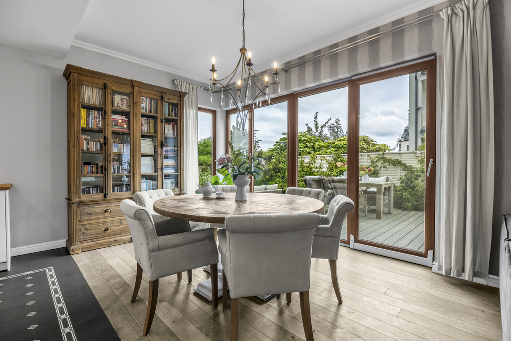 - Dining area with access to the terrace and garden