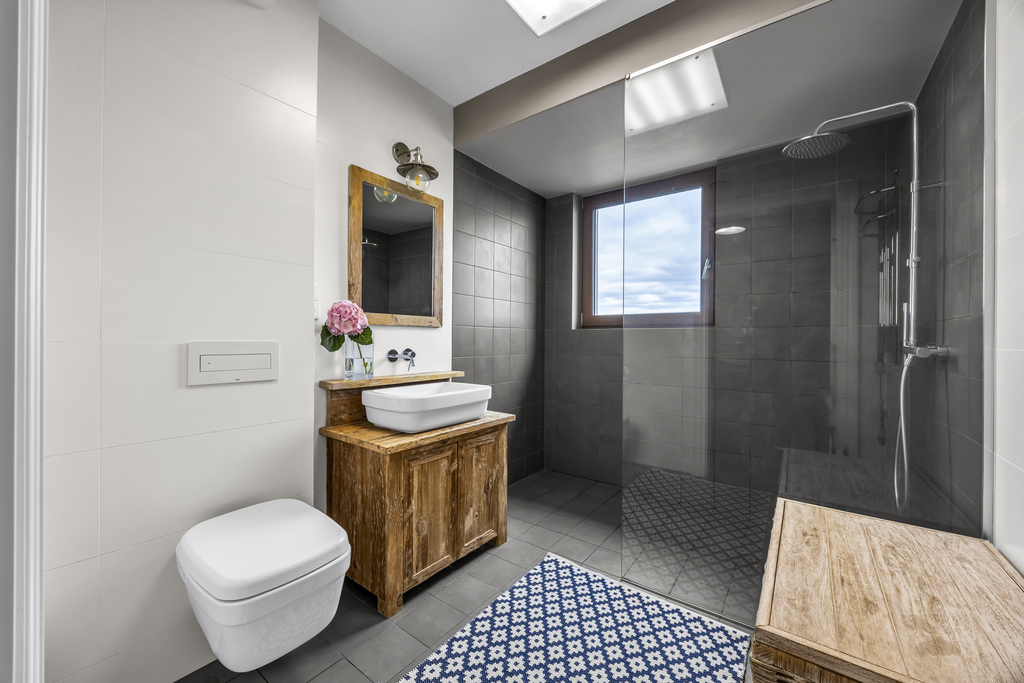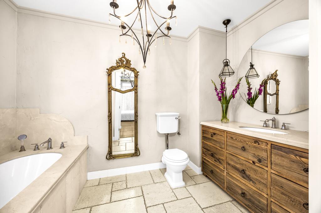 - Main bathroom finished with travertine and marble