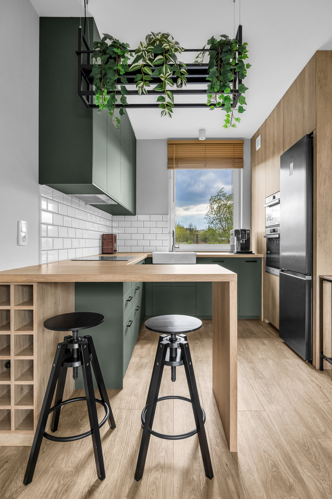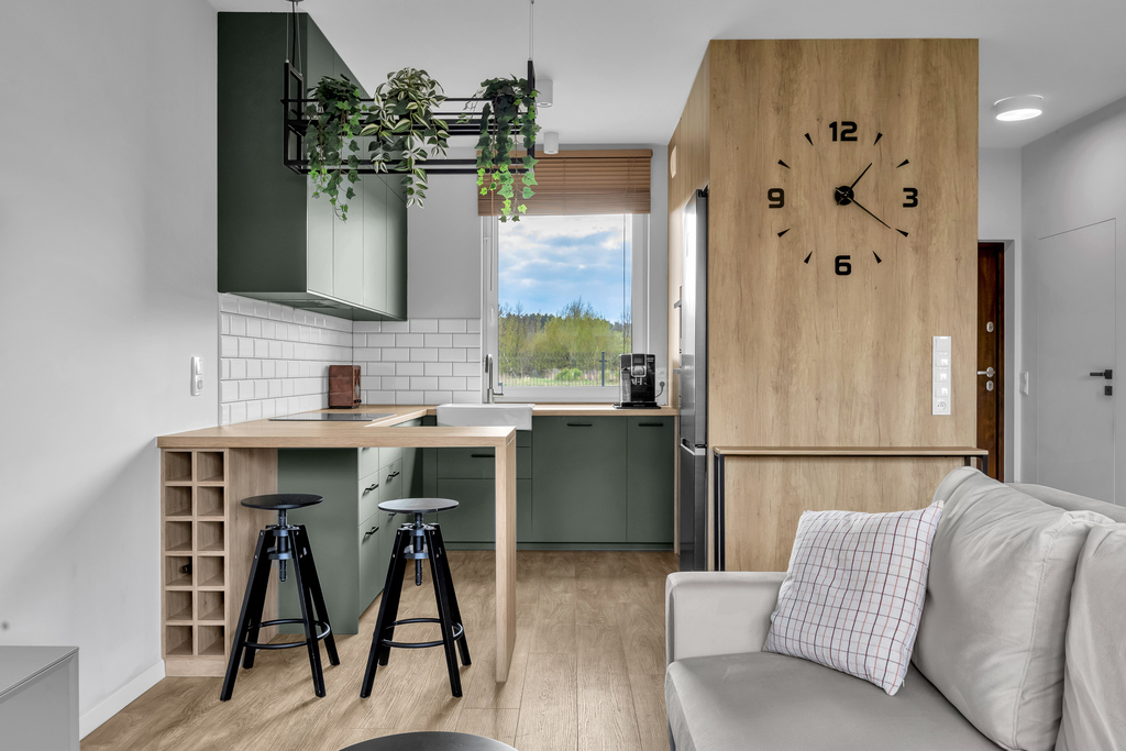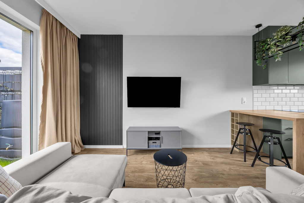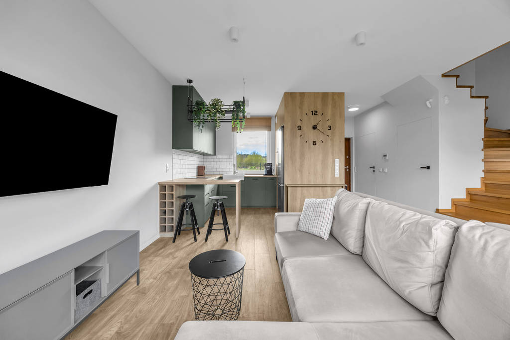 Parter składa się z salonu z jadalnią, w pełni wyposażonej kuchni, holu, łazienki oraz pomieszczenia gospodarczego. Z salonu wyjście na taras z ogródkiem.
