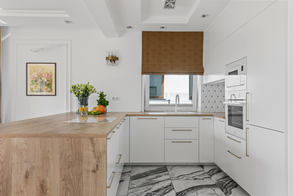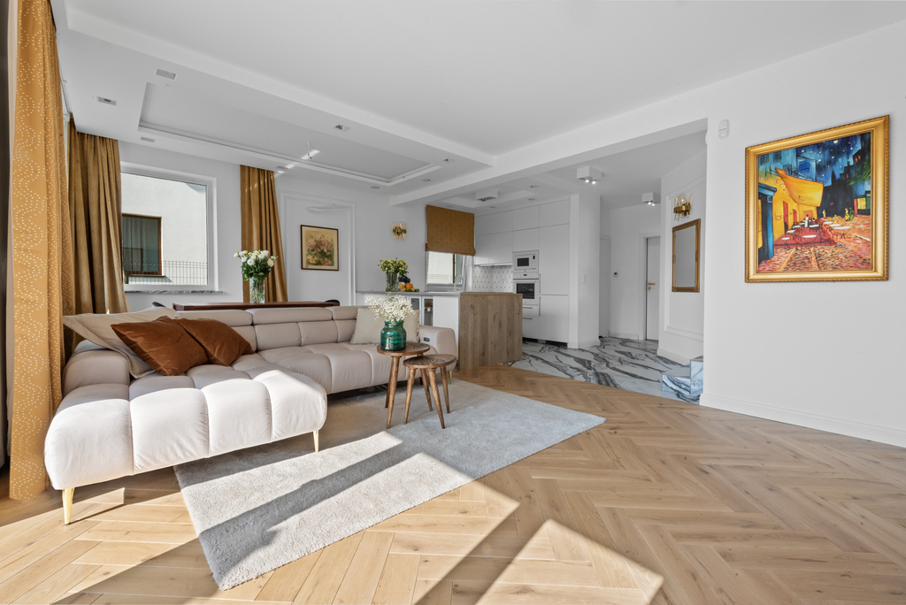 - ergonomiczna kuchnia połączona z salonem i jadalnią