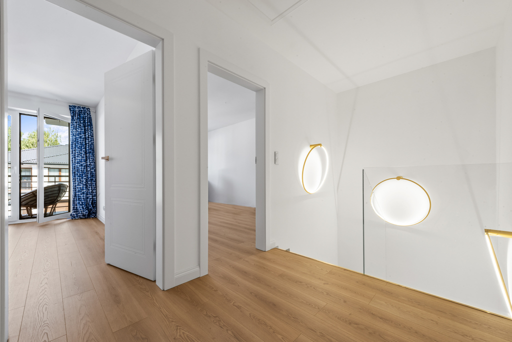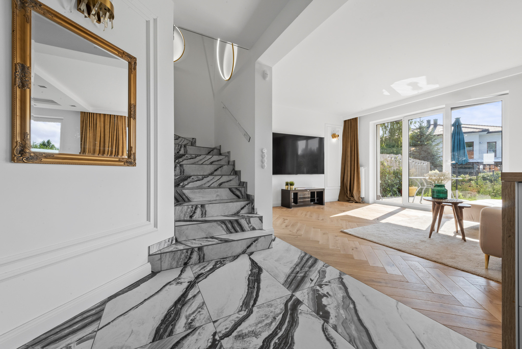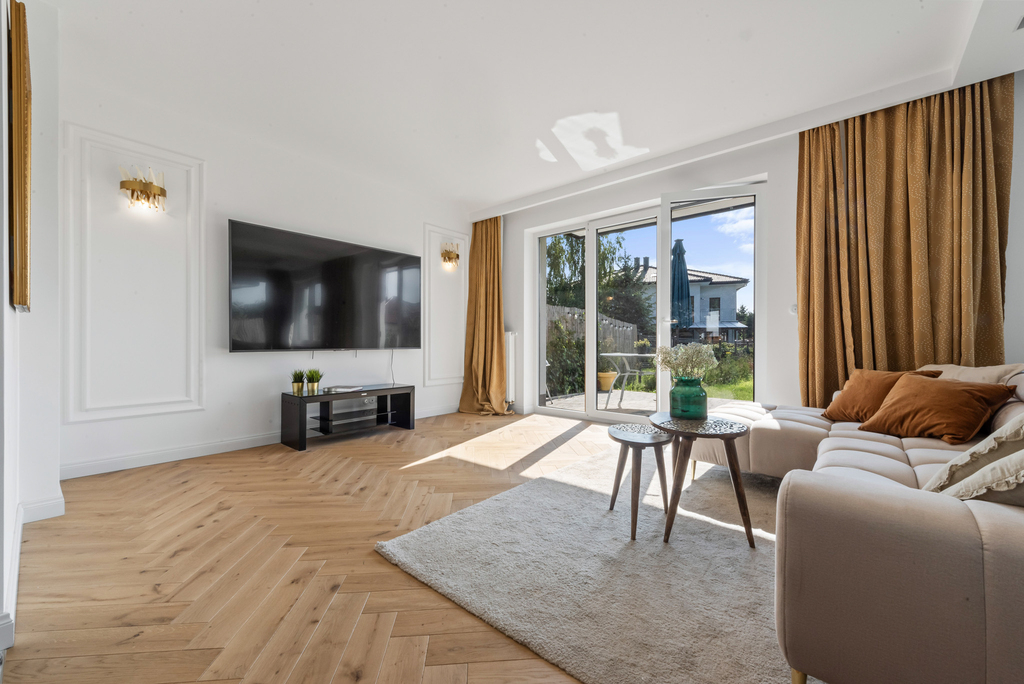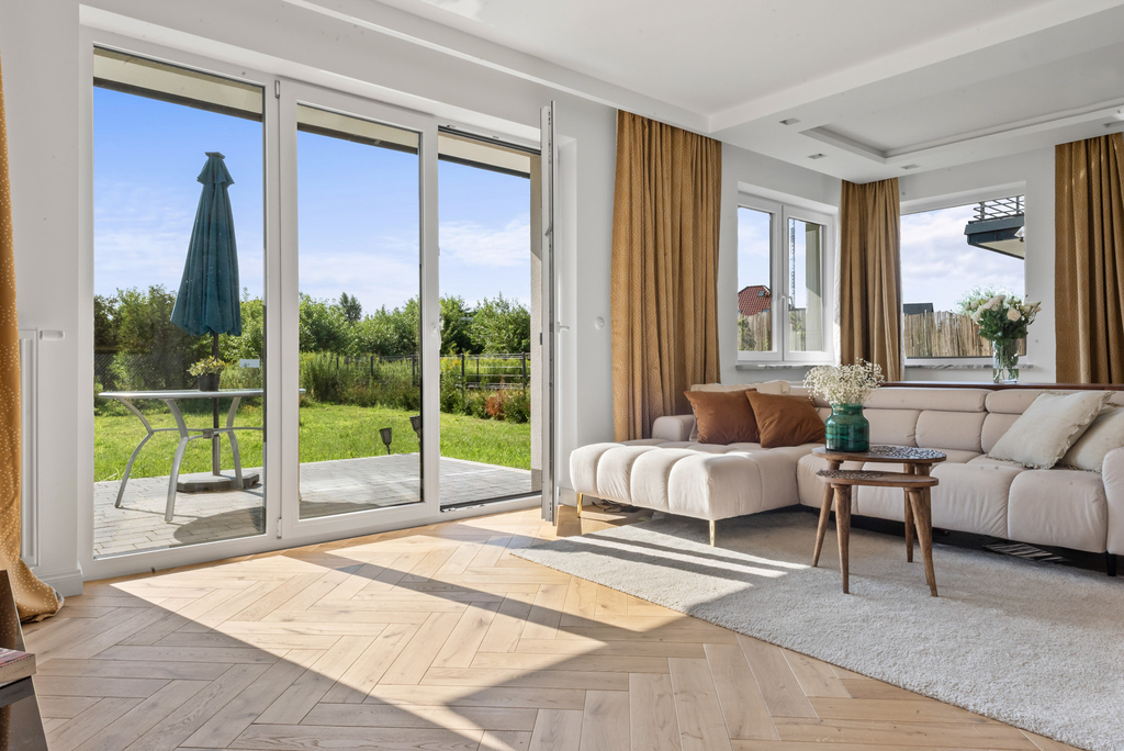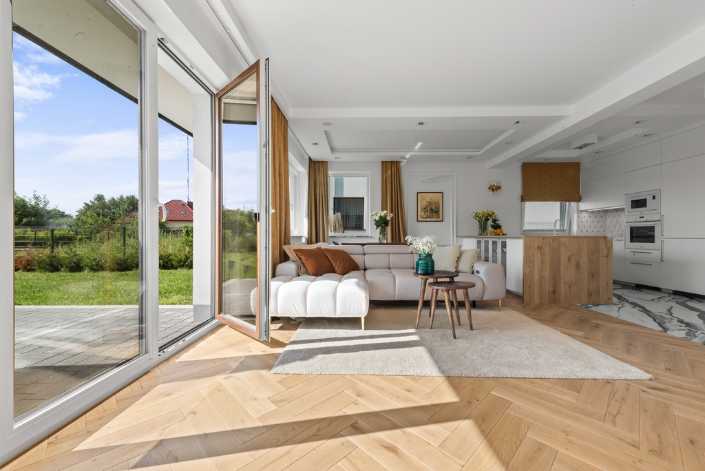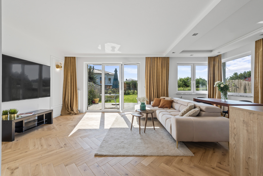 Standard wykończenia: Dom wykończony w wysokim standardzie. Na podłodze w salonie piękna deska dębowa natomiast w kuchni i korytarzu gres hiszpański. Funkcjonalna kuchnia, w pełni wyposażona, w łazienkach ceramika znanych marek, baterie podtynkowe. Wnętrze domu urządzono w nowoczesnym stylu z dbałością o detale i wygodę. Ciepłe kolory, naturalne materiały tworzą przytulną atmosferę.